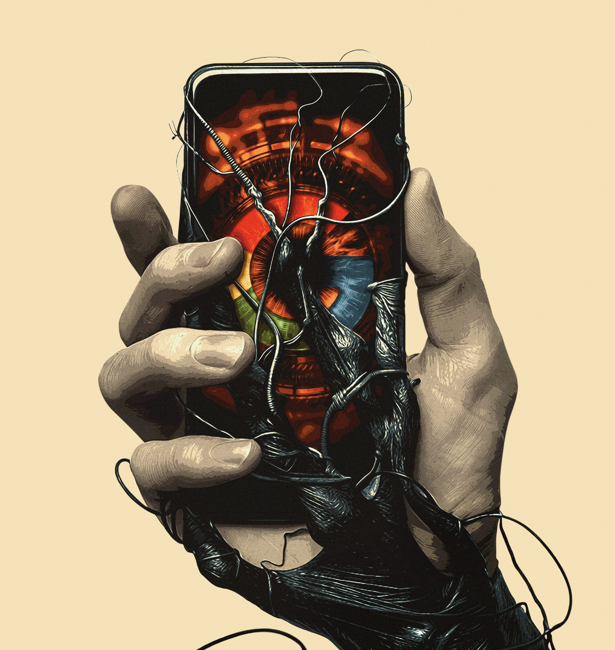 The final design features tendrils of a dark, parasitic creature, inspired by the sinister movement of Venom, emerging from a smartphone screen. These inky appendages snake up the user’s arm and begin overtaking their body, visually representing the way modern propaganda seeps into our consciousness, subtly and violently reshaping who we are.